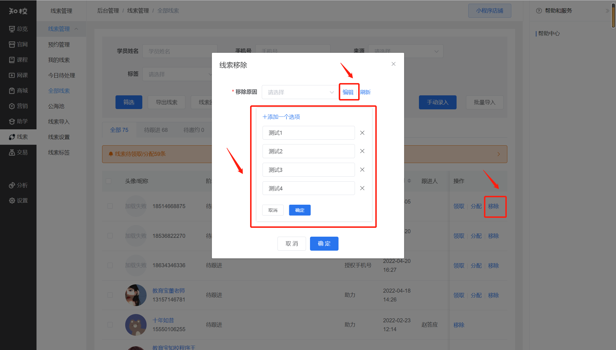 “線索”板塊,點(diǎn)擊“移除/轉(zhuǎn)讓”,可以直接選擇“移除/轉(zhuǎn)讓”原因,也可以新增“移除/轉(zhuǎn)讓”原因。