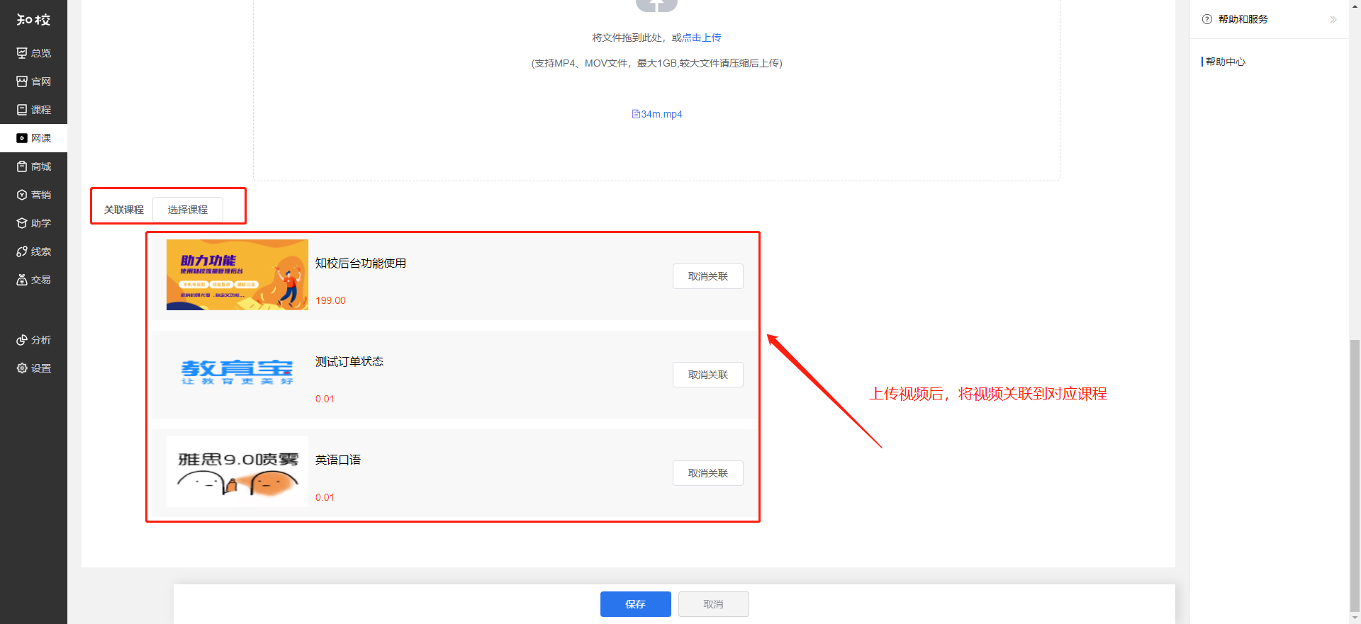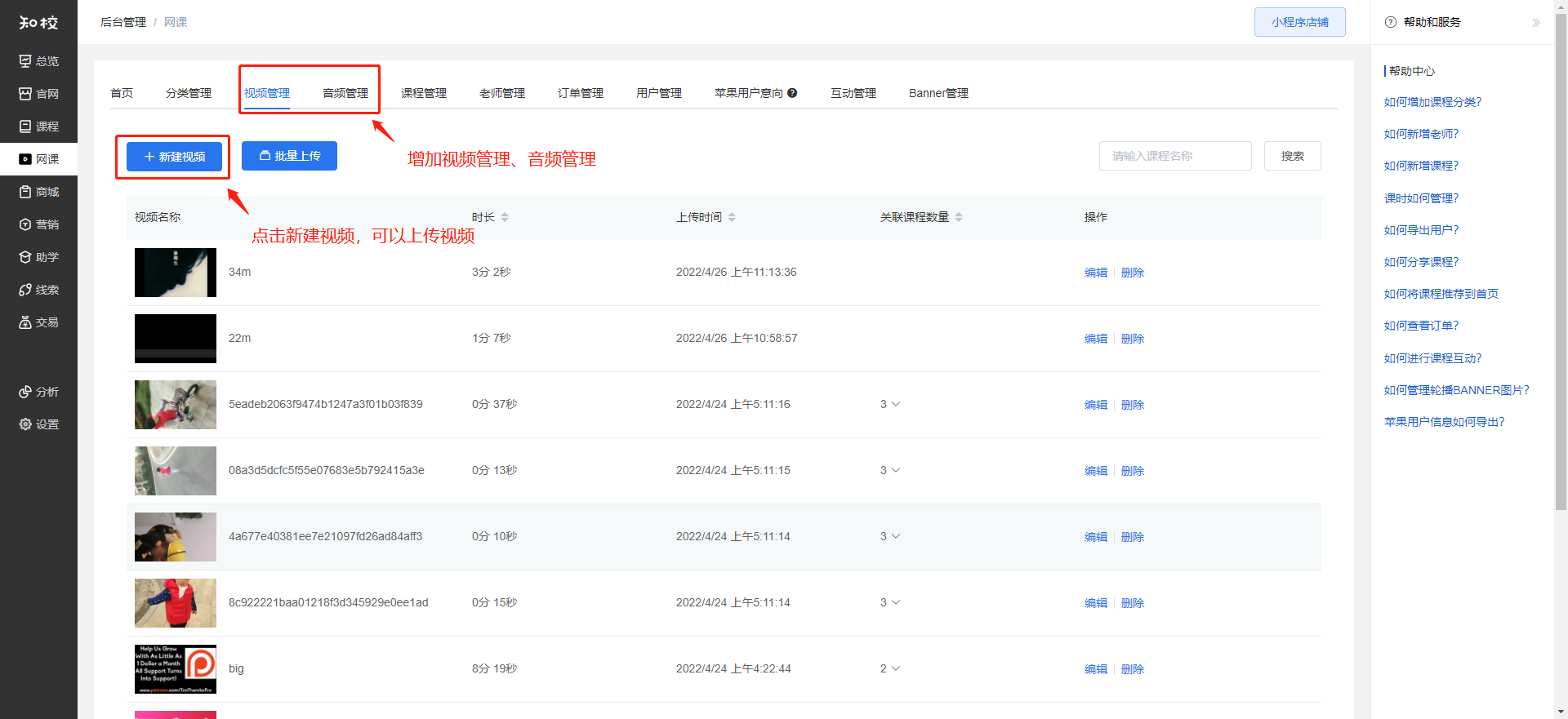 網(wǎng)課增加“視頻管理”、“音頻管理”,可以上傳視頻/視頻后,直接關(guān)聯(lián)到相應(yīng)的課程,解決了不同課程中有同一視頻時,需要多次重復(fù)上傳的問題。