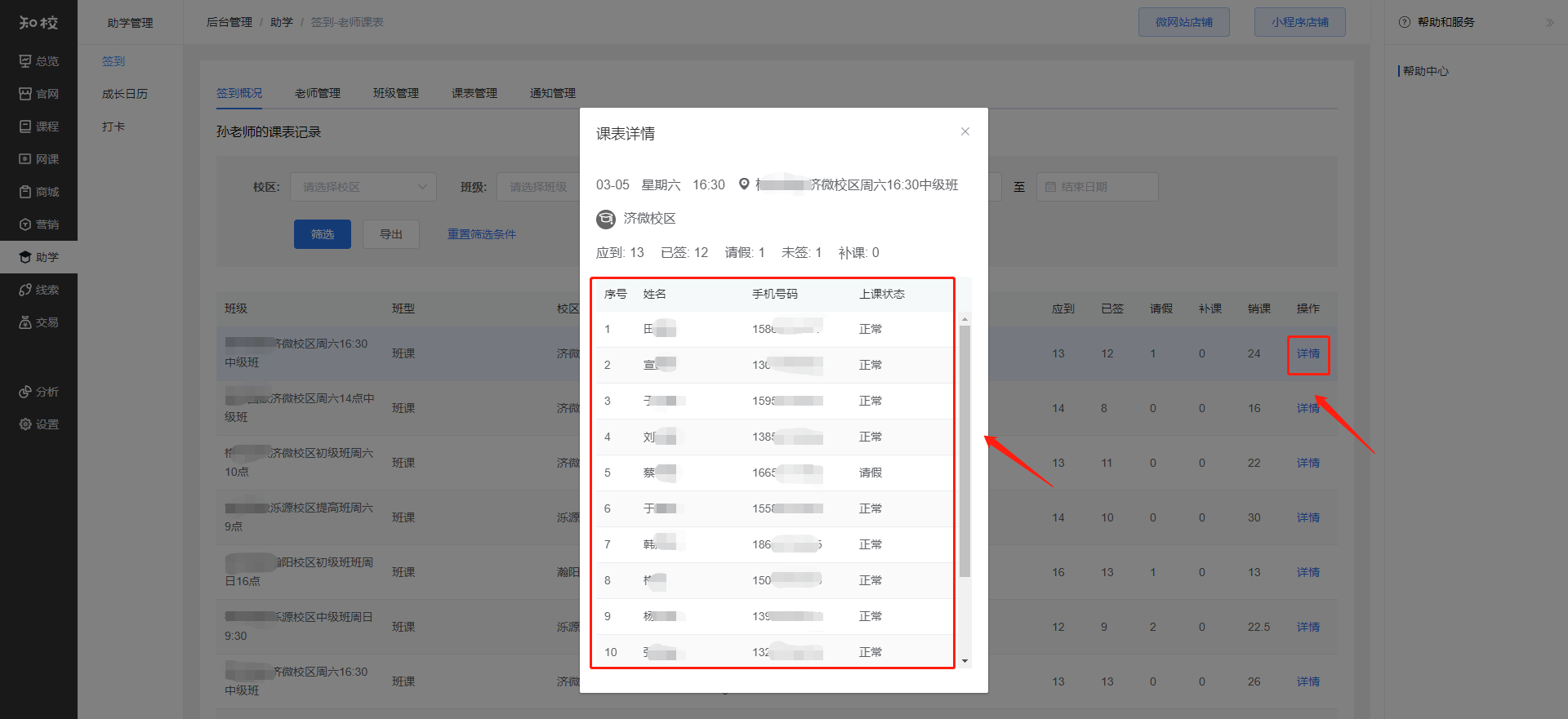 老師每節(jié)課的上課記錄,點(diǎn)擊上課詳情,可查看每個學(xué)生的上課情況