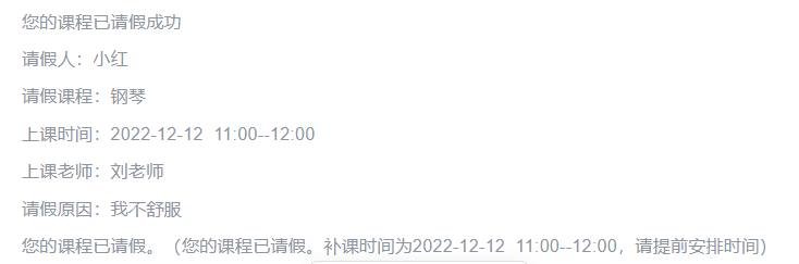 當(dāng)老師給學(xué)員請假時,增加給學(xué)員的微信提醒消息。消息內(nèi)容如下: