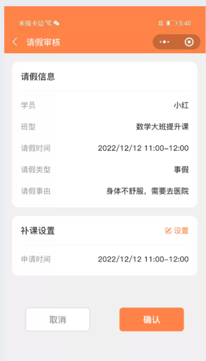 學(xué)員提交了請假申請后,會給老師在微信公眾號上發(fā)消息通知。老師點(diǎn)擊消息,可查看學(xué)員的請假詳細(xì)信息,確認(rèn)學(xué)員請假信息,給學(xué)員設(shè)置補(bǔ)課時間。