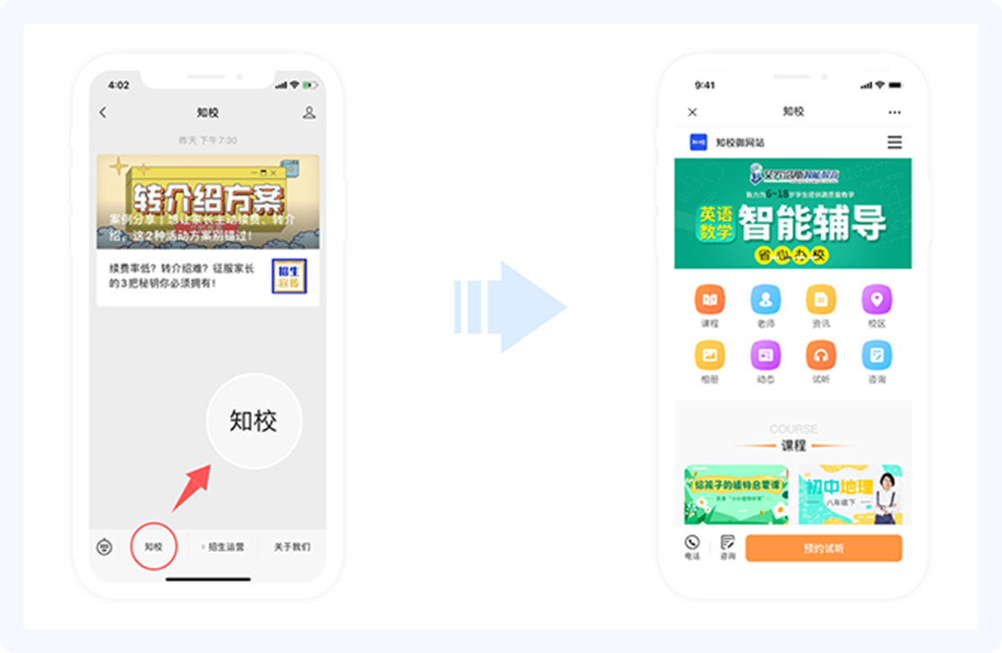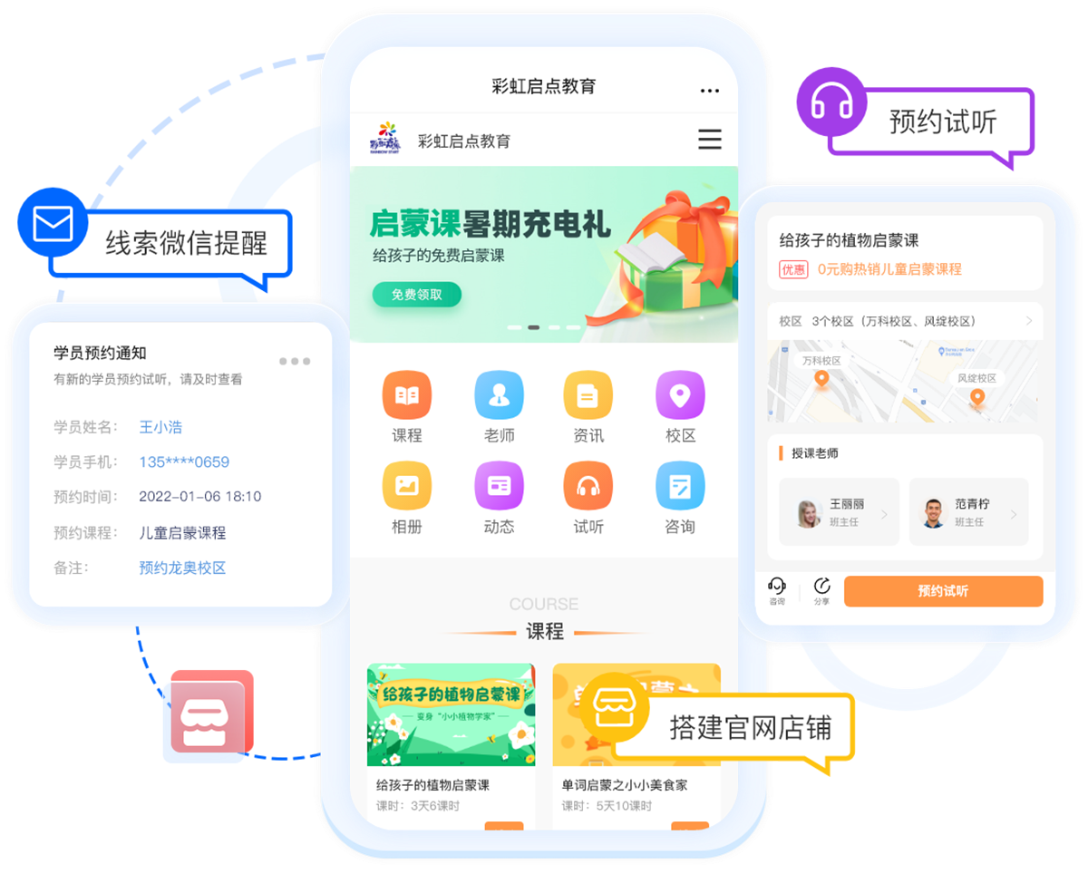 H5微網(wǎng)站又叫微官網(wǎng)或官方網(wǎng)站,讓教育機構(gòu)快速擁有自己專屬的微官網(wǎng),網(wǎng)站獨立管理和運行、展示機構(gòu)官方電話和微信、接收專屬的意向?qū)W員咨詢表單,屬于真正的私域流量運營基礎(chǔ)設(shè)施。除了原始圖文可能來自教育寶平臺的數(shù)據(jù)庫外,其他數(shù)據(jù)信息與教育寶平臺資源隔離。